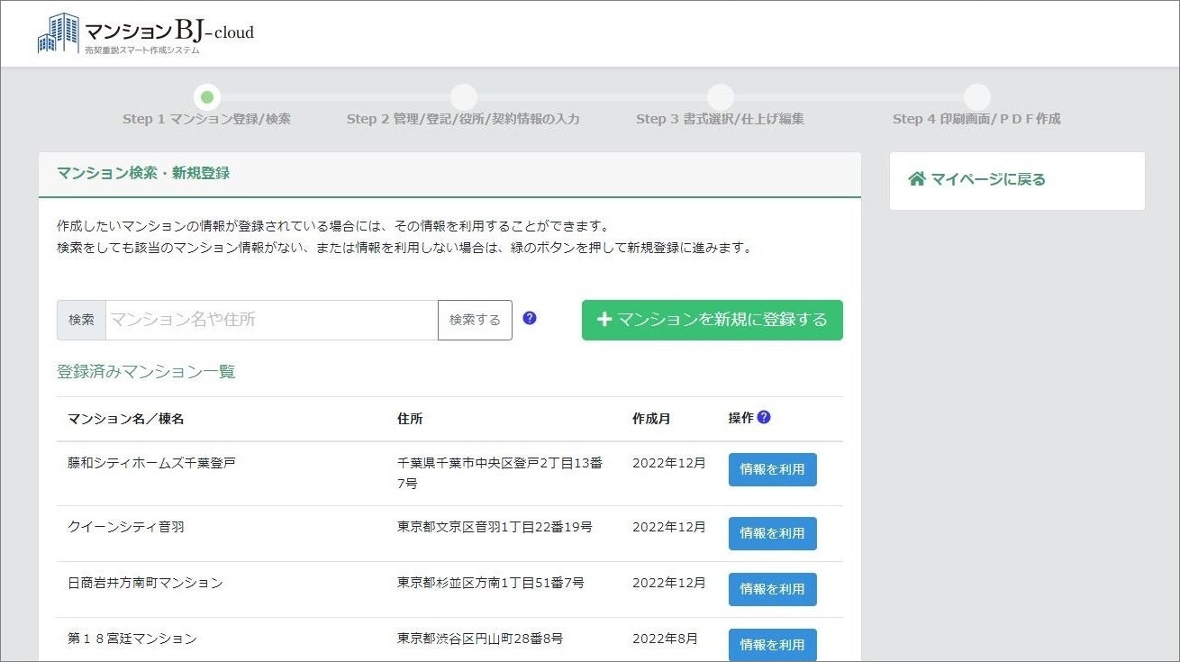 この度、これらの実績を基に開発した、マンション売買の重要事項説明書・売買契約書の作成システムを、クラウドサービス『 マンションBJ-cloud 』として不動産事業者様向けに提供を開始いたします。