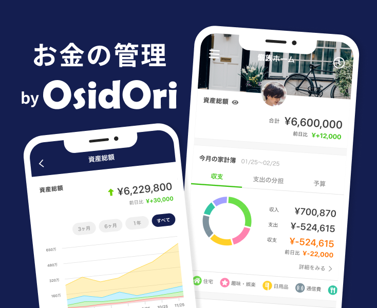 「お金の管理 by OsidOri」は、夫婦・カップルや個人など、誰もが便利に家計管理ができるお金のマネジメントサービスです。(一部有料機能があります。)