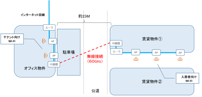 オフィス利用向け物件にインターネット回線を引き込み、公道を挟んだ賃貸物件と60GHzで無線接続を行い1本のインターネット回線を2物件でシェアします。シェアした回線を利用してテナント向け、入居者向けWi-Fiサービスの提供実験を実施致します。