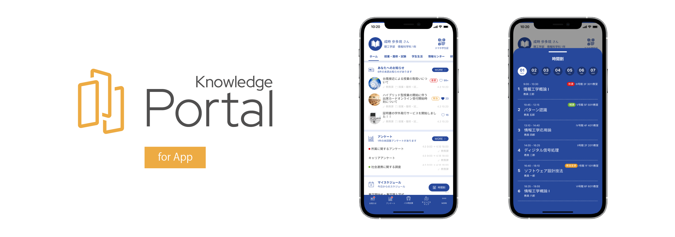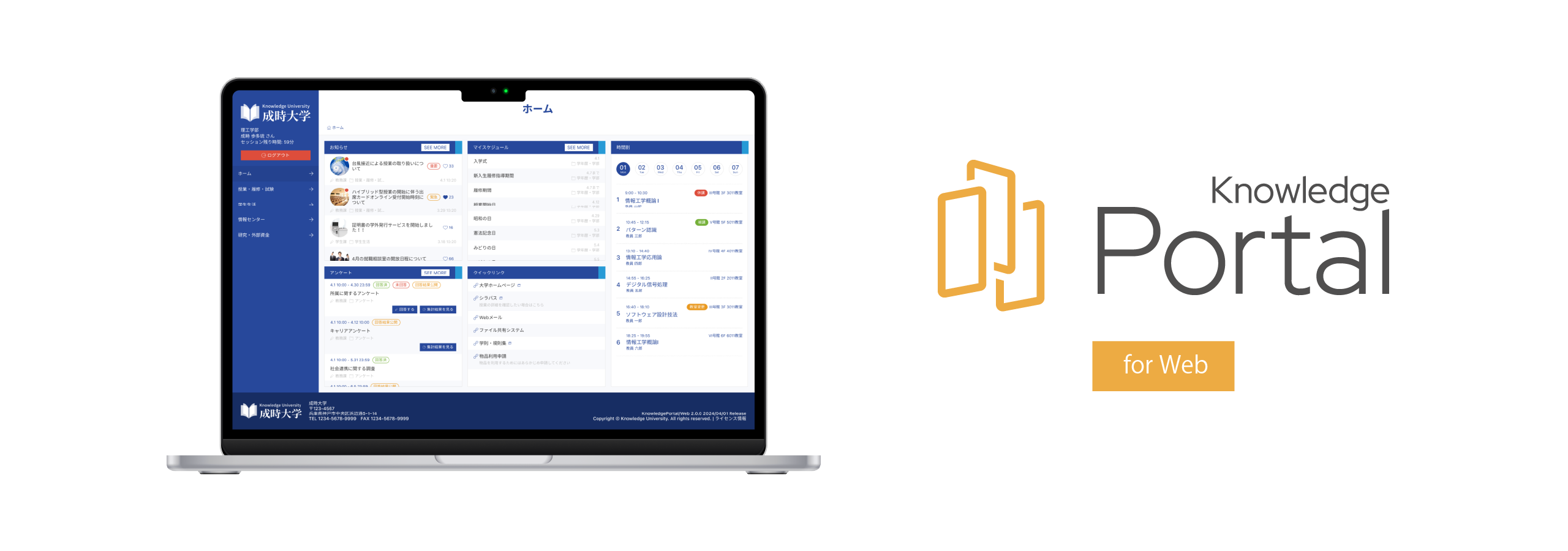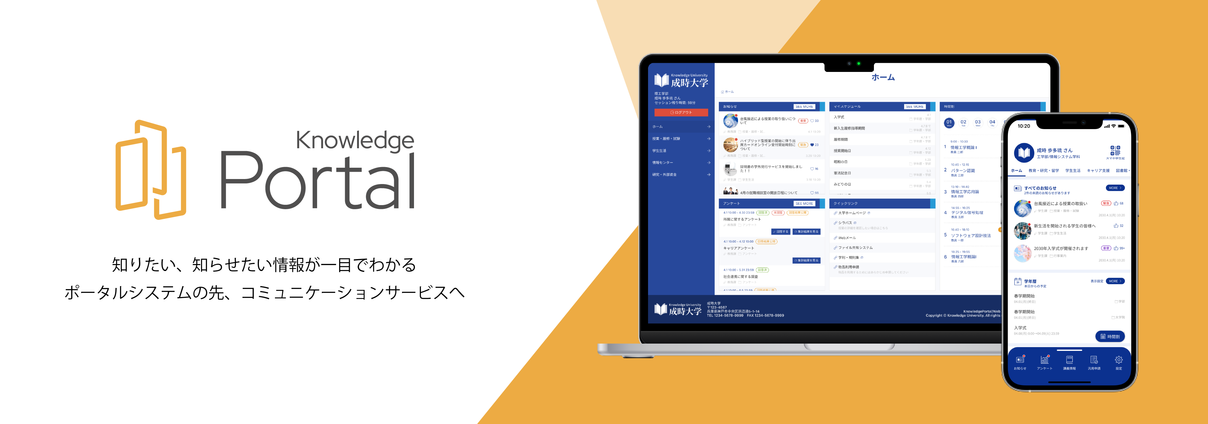 「Knowledge Portal」は学生・教職員のアカウント管理や認証基盤、お知らせの配信、アンケート、ファイル共有など、学内サービスの中心となるための大学ポータルサービスです。