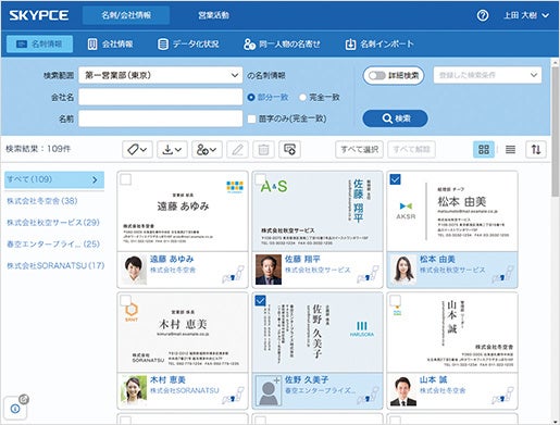 顧客、ビジネスパートナーの開拓など、ビジネスの第一歩となる名刺交換。業務で得た名刺を安全に管理し、活用いただくために開発されたのが「SKYPCE」です。会社・組織全体で集約した名刺情報を「SKYPCE」上で管理し、営業活動などに活用することができます。