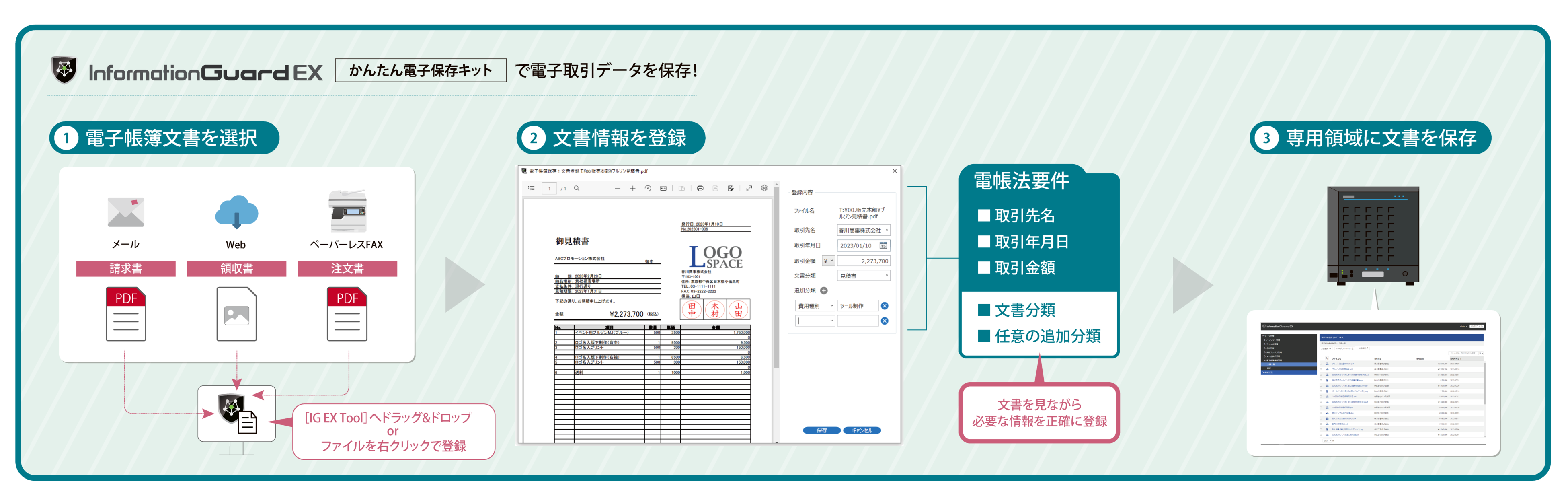 そこで、電子取引データの保存方法として定められた「真実性の確保」(データが改ざんなどされていない本物と確認できること)と「可視性の確保」(必要な時にいつでも視認・確認できること)という2つの要件に沿って該当データをInformationGuard EXに手軽に保存・管理できるソリューションとして「かんたん電子保存キット」を新たに開発。幅広い中小企業の法令対応と業務効率化、DX推進を支援してまいります。