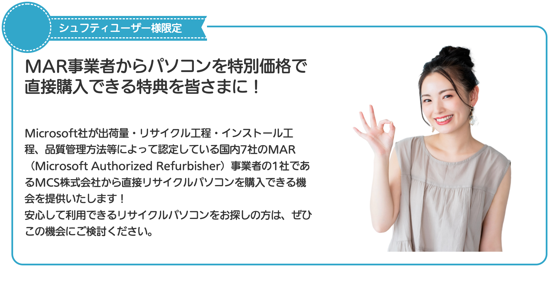 「シュフティ」ではこのたび、Microsoft社認定のリサイクルパソコンをクラウドワーカーへ特別価格にて販売することにいたしました。これまで「シュフティ」では、「シュフティ」で活躍したいと思っているクラウドワーカーの抱える、「パソコンがない(携帯・スマートフォンのみや、家族共用PCなど)」「容量が足りない」「パソコンを買い替えたい」といった、仕事環境に関する悩みの解決が課題となっておりました。このように、“働きたいけれど十分な環境がないために仕事の幅が制限される“クラウドワーカーの働く環境を支援したいと考えるうるるの思いが、本企画の実施へと至りました。