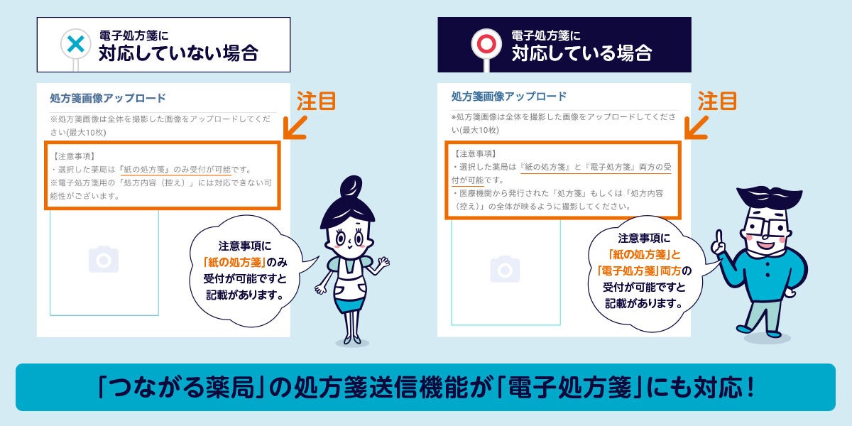 「つながる薬局」は、病院でもらった処方箋を事前に薬局に送信する「処方箋送信機能」を有し、従来より患者さんの待ち時間削減、感染症対策等に貢献しています。今回、これまでの「紙の処方箋」をスマートフォンで撮影し薬局に送信する方法に加え、電子処方箋の運用開始とともに、電子処方箋選択時に発行される専用の引換番号が記載された「処方せん(控え)」の送信にも対応いたしました。