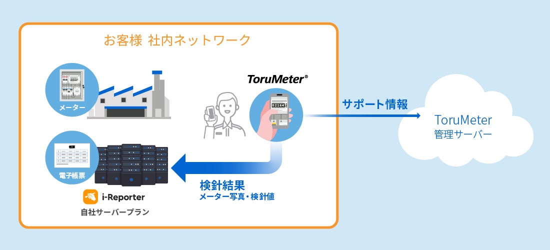 なお、本サービスは、ToruMeter®で検針した結果(データ)を自動入力する検針票(株式会社シムトップスのConMas i-Reporterの電子帳票)を自社サーバー上で運用する“自社サーバープラン”を導入済み、またはこれから導入するお客様向けのサービスとなります。