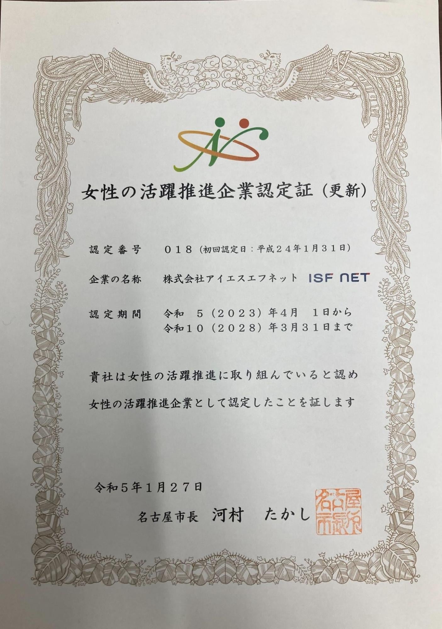 弊社は、平成23年度、平成26年度、平成30年度に認定していただいており、今年改めて更新認定いただきました。