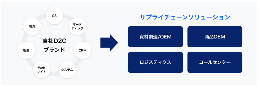 D2C支援企業として、ビッグデータ解析による世の中のニーズの抽出、商品開発、基幹システム「ecforce」の提供、広告運用、生活者のもとへ商品を直接届けるところまで、全ての工程をワンストップで支援。