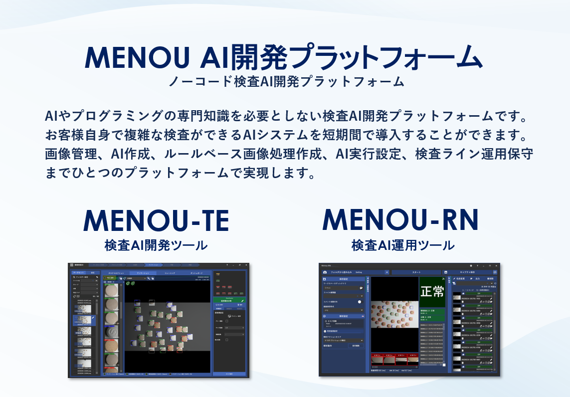 「MENOU AI開発プラットフォーム」( https://menou.co.jp/menou-te/ )は、AIの専門知識を必要としない画像AI開発のための統合開発環境です。複雑な検査・検品・点検ソフトウェアをプログラミングすることなく、ノーコードで開発することを可能にします。