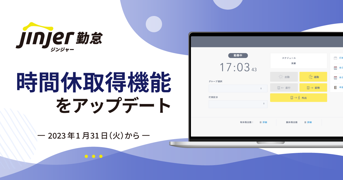 jinjer株式会社(本社:東京都新宿区、代表取締役CEO:加藤 賢)が提供する、バックオフィス向けクラウドサービス「ジンジャー勤怠」の、時間単位年休取得機能を2023年1月31日(火)にアップデートしたことをお知らせします。