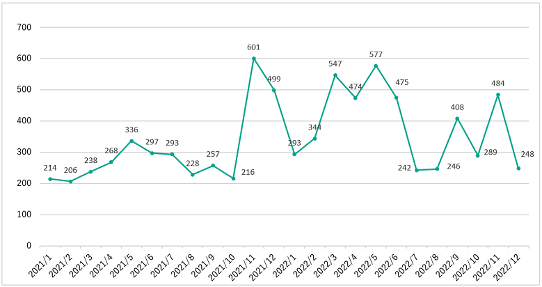ランサムウェアを仕掛ける攻撃者が、企業や組織に対して行った不正侵入を自らのブログに投稿するケースが多くなっていますが、2022年も増加傾向にありました。2021年初めに観測した際は月200~300件でしたが、2021年末から2022年上半期にかけて、500件を超える月がありました。下半期も9月に約408件、11月にも484件の投稿を確認しました。これらのデータは当社のDigital Footprint Intelligence※2によるものです。