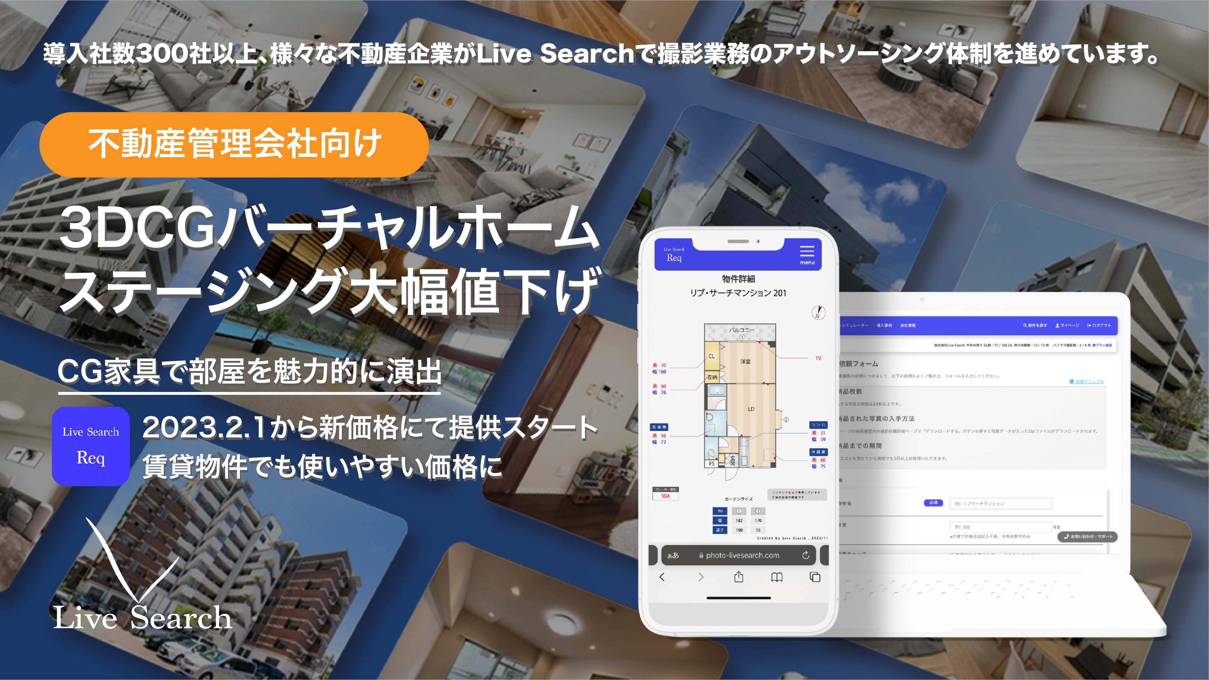 「世の中の不動産情報をカタログ化する」をビジョンに掲げ、不安の無い不動産情報の発信のために不動産会社に向けてBtoBサービス提供を行っています。導入実績300社以上のメインサービスの一つである物件写真撮影・間取り図作成クラウドサービス「Req(レック)」は、主に不動産管理会社様向けのサービスとして展開しており、物件写真や寸法情報入り間取り図、バーチャルホームステージング以外にも、動画や360°パノラマVRのコンテンツも用意しています。不動産管理会社様は、これまで自社で行ってきた撮影業務時間を大きく削減でき、かつプロによるクオリティの高いデータを簡単に入手できるようになります。Reqの特徴として、導入した会社様の平均空室期間が60日短縮されるなどの効果も出ており、サービス利用継続率99.8%を誇っています。