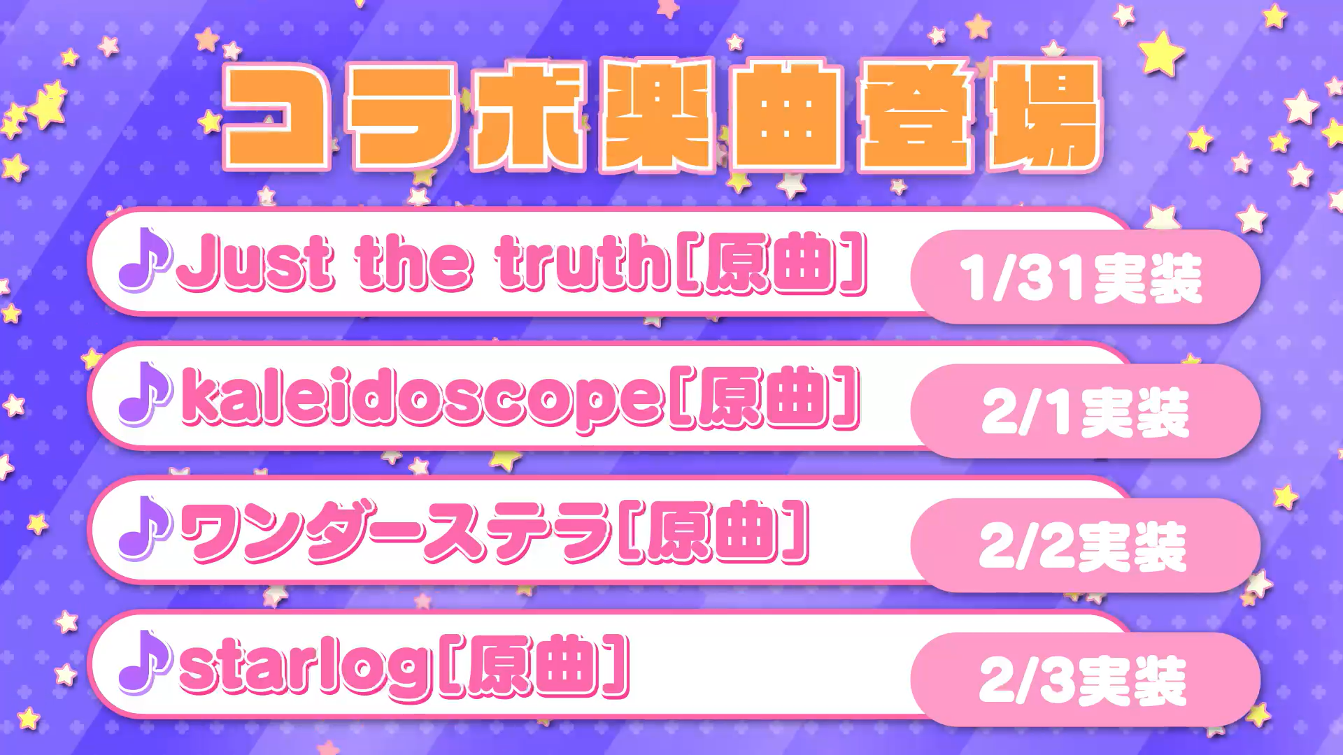 コラボ楽曲として「Just the truth」「kaleidoscope」「ワンダーステラ」「starlog」を原曲で実装いたします。