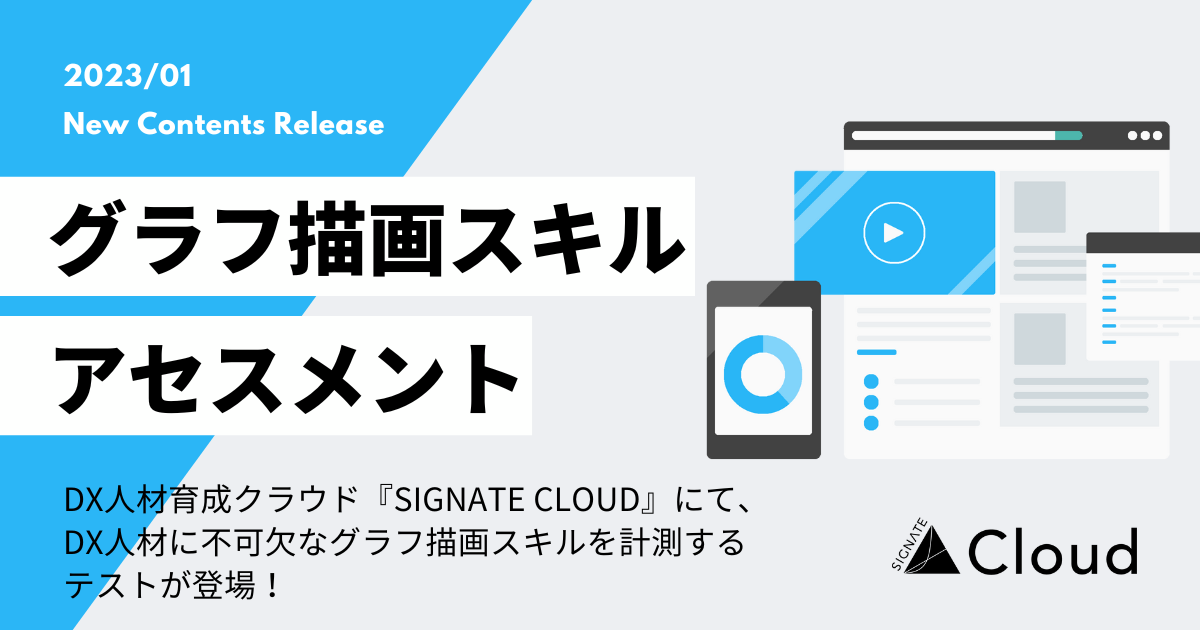 DX人材育成クラウド『SIGNATE Cloud』にて提供するデータスキル計測アセスメントは、DX人材に不可欠なデータ活用能力に必要な基礎的なスキルを計測することが可能です。