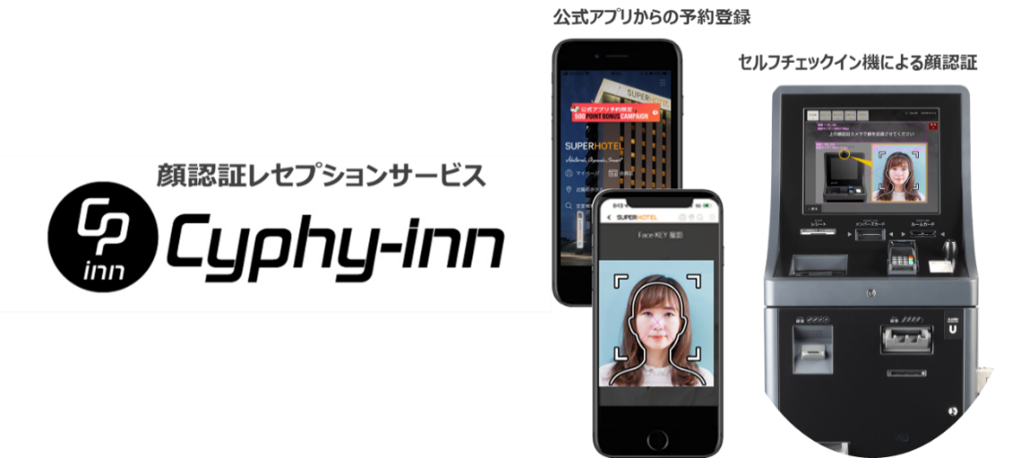 顔認証レセプションサービス『Cyphy-inn』では、まずスーパーホテル公式アプリから宿泊予約と同時に自身の顔を登録します。その後来館の際、館内のチェックイン機で自身の顔を撮影することで予約情報と照合し、セルフチェックインが可能になります。