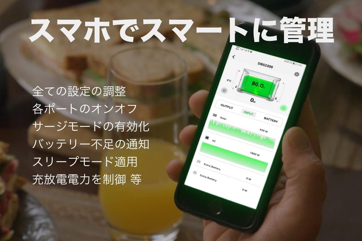 専用のアプリケーションを使えばポータブル電源本体にはノータッチで電力や充電の設定・操作・管理などが可能。単体では効かない細かな調整やバッテリー不足の通知など、より便利にスマートにお使い頂けます。