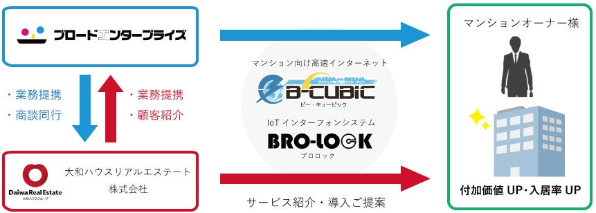 大和ハウスリアルエステートが主たる事業とする不動産管理事業にて、当社のマンション向け高速インターネット「B-CUBIC」及びIoTインターフォンシステム「BRO-LOCK」を、管理する賃貸物件の所有者様に紹介、導入提案を行います。なお、具体的な実施内容につきましては、今後物件ごとに、それぞれ個別に締結する契約書において詳細を定める予定です。