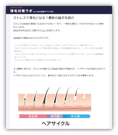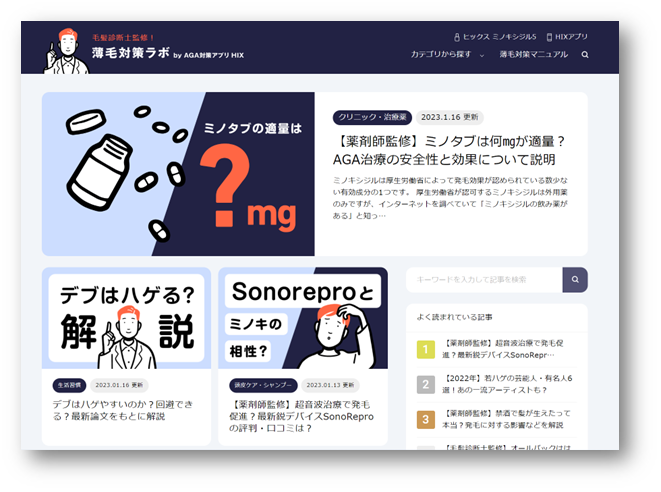 HIXアプリユーザーから寄せられた「薄毛やAGAの疑問・悩み」と、ヘアケアカウンセラーによる「回答内容、解決方法」をもとに記事構成を行い、医師や薬剤師、管理栄養士、毛髪診断士など専門家監修のもと、最新の毛髪科学や臨床試験データなどの医学的根拠に基づいた記事を制作いたします。また、ユーザーの悩みの種類に応じて適切な記事へナビゲートする「薄毛対策マニュアル」を備え、1人1人の薄毛・AGAの予防や治療の疑問や悩みに寄り添います。