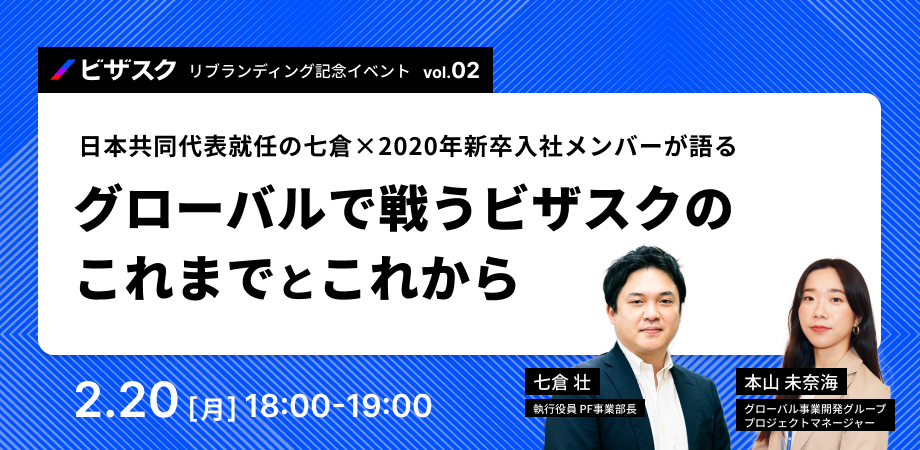 新経営体制への移行に伴い、新日本共同代表に就任する七倉と、新卒で当社に入社しグローバル事業の第一線で活躍するメンバーが本音で対談。若手がグローバル最前線で活躍するには?ビザスクでどんな挑戦ができるのか?そのリアルをお話しいたします。