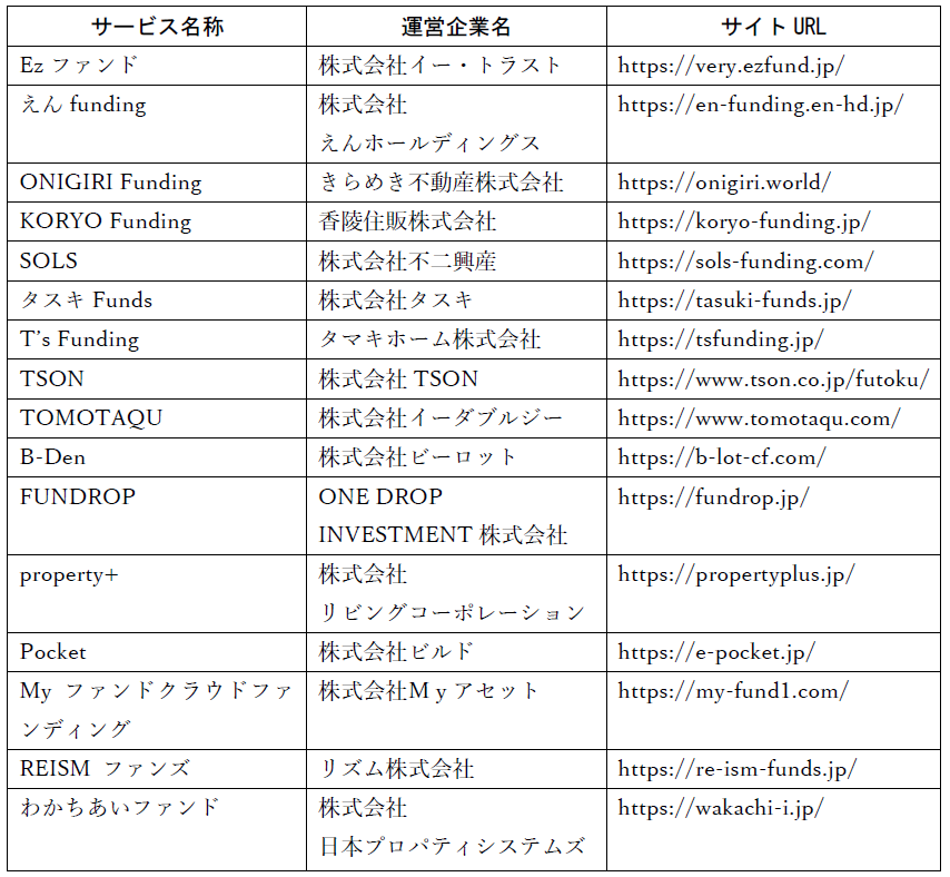 情報を掲載する不動産クラウドファンディングの運営企業は以下の16社となります。