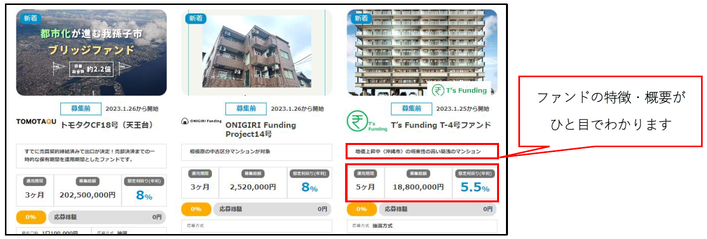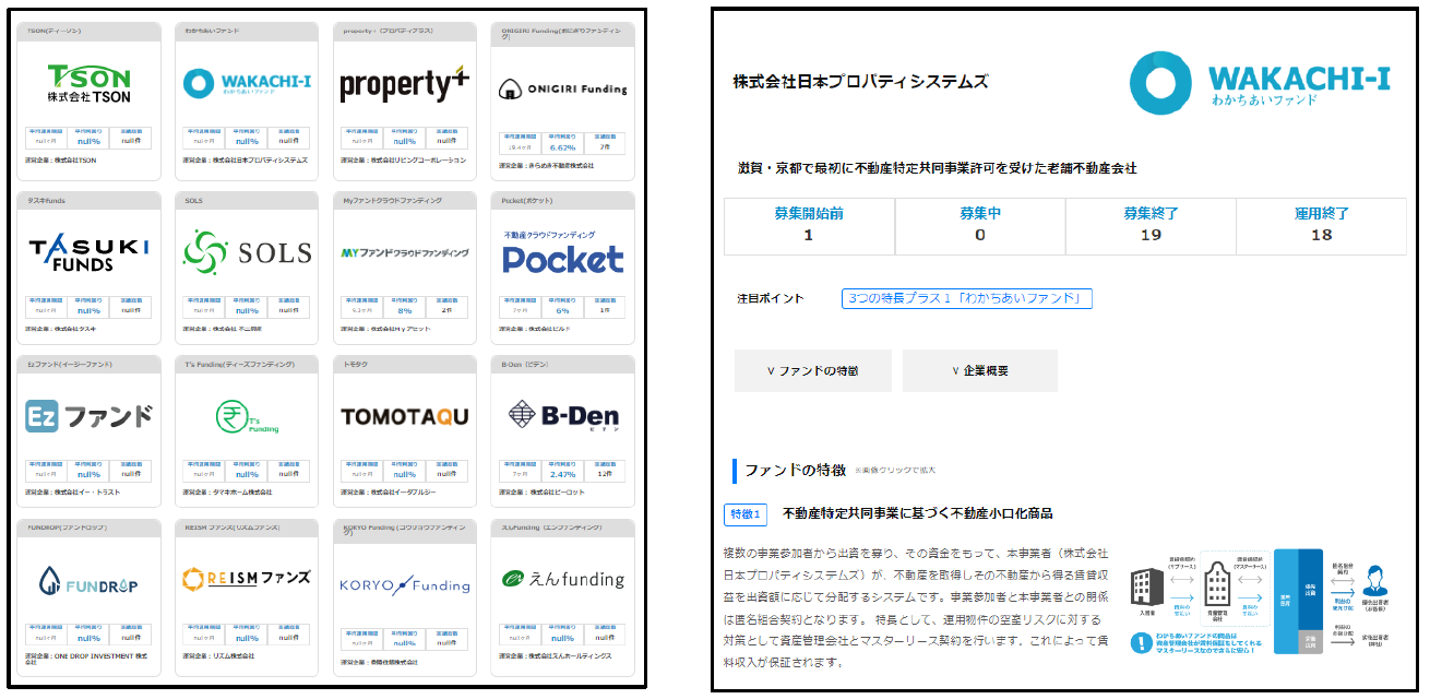 『YANUSY Funding』は、不動産クラウドファンディング事業を行う運営企業の協力のもと、各企業が個別に募集・運用する不動産クラウドファンディングの情報を集約して一括で投資家に提供する総合情報サービスです。『YANUSY Funding』では運営企業と運用ファンドの最新情報を自動的に収集するシステムを構築しており、投資家の皆様はリアルタイムにいつでも最新の不動産クラウドファンディングの情報を閲覧いただくことが可能となっております。
