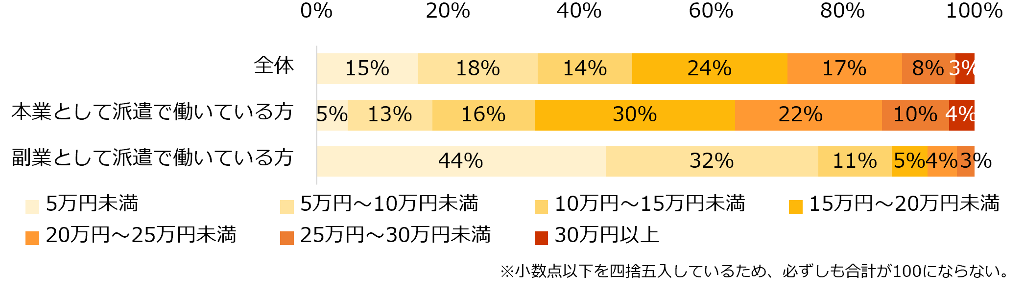 現在派遣で働いている方に月収を伺うと、本業として派遣で働いている方の最多は「15万円~20万円未満」(30%)、副業として派遣で働いている方の最多は「5万円~10万円未満」(32%)でした。