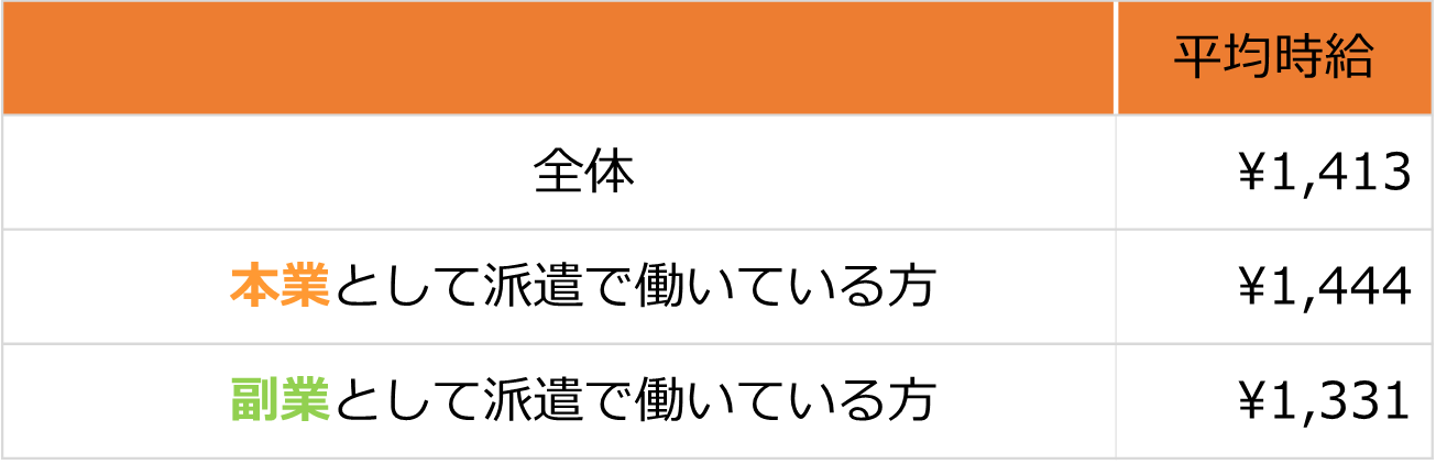 ★ 平均時給、派遣を本業としている方は1,444円、副業の方は1,331円。職種別では「IT系」が1,989円で最高。「オフィスワーク系」は1,453円。