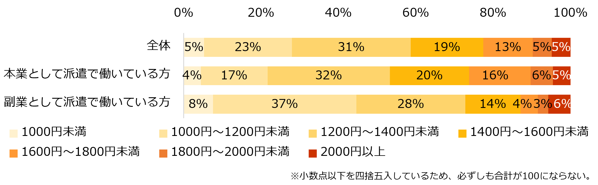現在派遣で働いている方に時給を伺い、平均を算出すると1,413円になりました。働き方の違いで見ると、本業として派遣で働いている方の平均時給は1,444円、副業として派遣で働いている方は1,331円でした。時給帯の割合を見ると、本業として派遣で働いている方で最も多いのは「1,200円~1,400円未満」(32%)で、副業として派遣で働いている方で最も多いのは「1,000円~1,200円未満」(37%)でした。