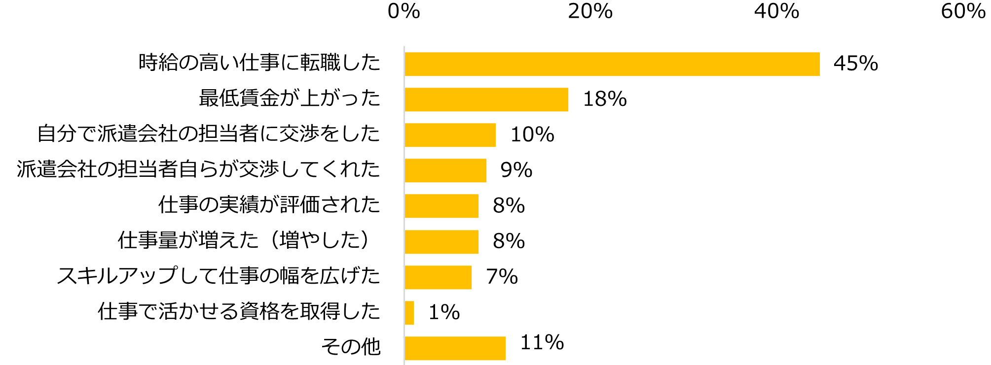 現在派遣で働いている方に「昨年同時期と比較して、派遣での給料・時給はアップしましたか?」と伺うと、アップした方は24%でした。給料・時給がアップした方に「時給換算でいくらアップしましたか?」と聞くと、上位が「10~50円未満」(31%)、「50~100円未満」(19%)である一方で、第3位に「300円以上」(18%)がランクインしました。続けて、アップした理由を伺うと、トップは「時給の高い仕事に転職した」(45%)で、次点に「最低賃金が上がった」(18%)が続きました。