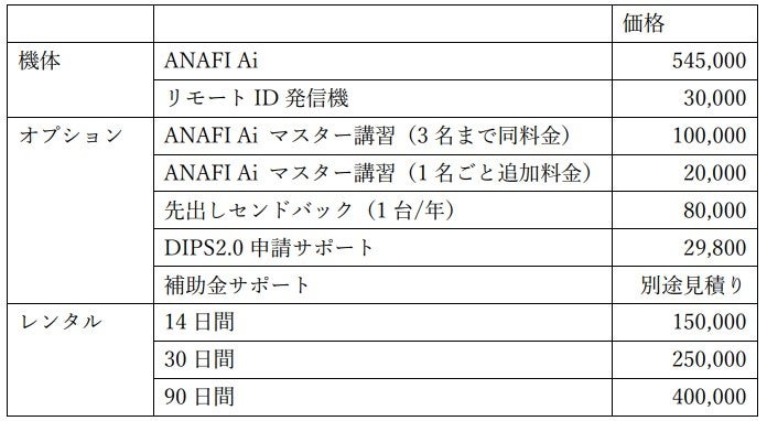 このようなニーズをふまえ、「機能」「セキュリティ」「サポート」の観点から、自治体や公共事業に関わる法人向けに最適な機種を検討した結果、セキュリティ対策を確保したうえで、空撮時に地上の様子を高精細に撮影可能なカメラ性能に優れ、LTE上空利用への対応や防水防塵性能IP53に対応した欧州最大手のドローンメーカーであるParrot社製のANAFI Aiの提供を開始します。