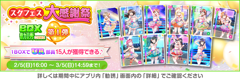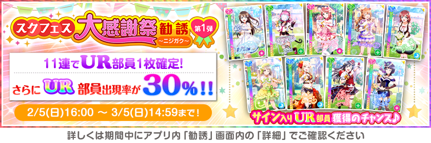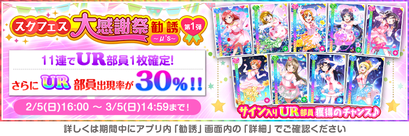 スクフェスを可能な限りお楽しみいただけるよう、サービス終了までの期間に、スクフェス大感謝祭キャンペーンを実施いたします。