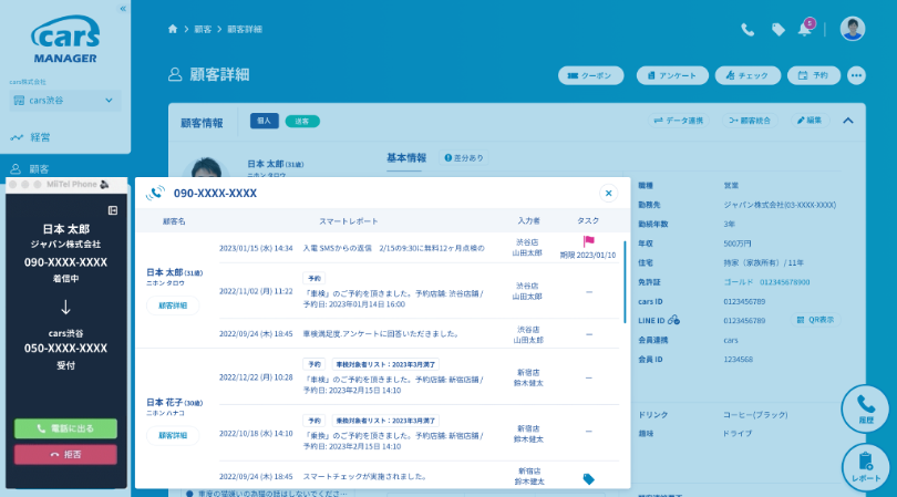 この連携により、「cars MANAGER」の操作画面上にて、「MiiTel」の受発信が可能になり、お客様とのコミュニケーションを円滑に行えるようになります。また、「MiiTel」の通話記録URLの自動連携により、メンバー間で情報共有や蓄積を効率的に行うことも可能になります。