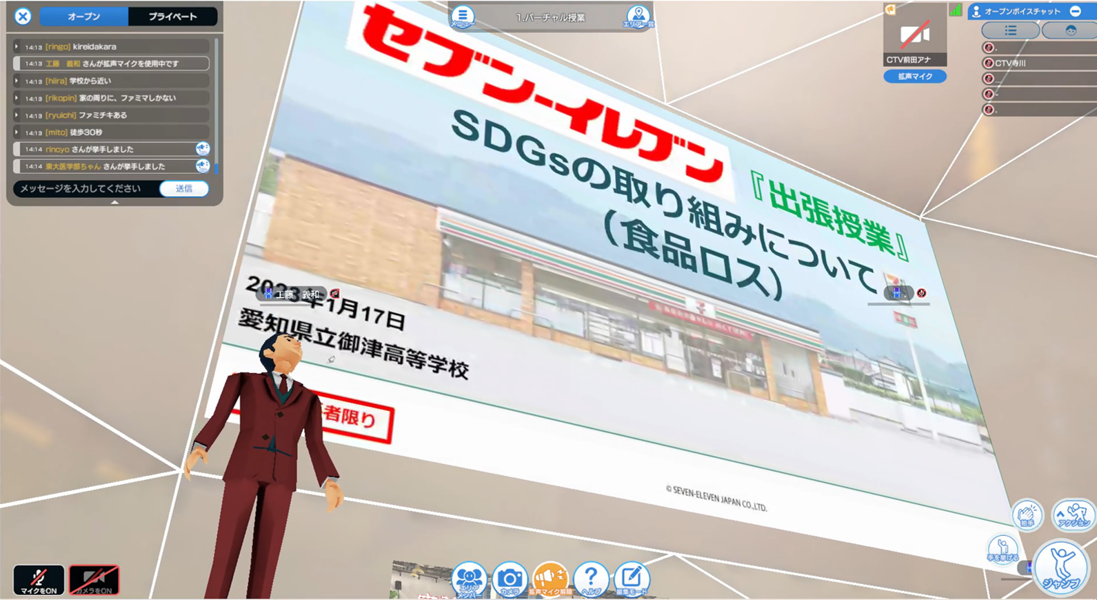 メタバースを活用することにより、高校教育に取り入れられているSDGs教育や金融教育など専門性が高いジャンルに関して、実際に当該分野への取り組みを行う企業の方から直接指導頂くことができます。今回の授業においては、東京都に居るセブン-イレブン社員と愛知県に居る生徒がメタバース空間内で一堂に会し、セブン-イレブンが行うSDGsの取り組み紹介及びディスカッションをすることができました。