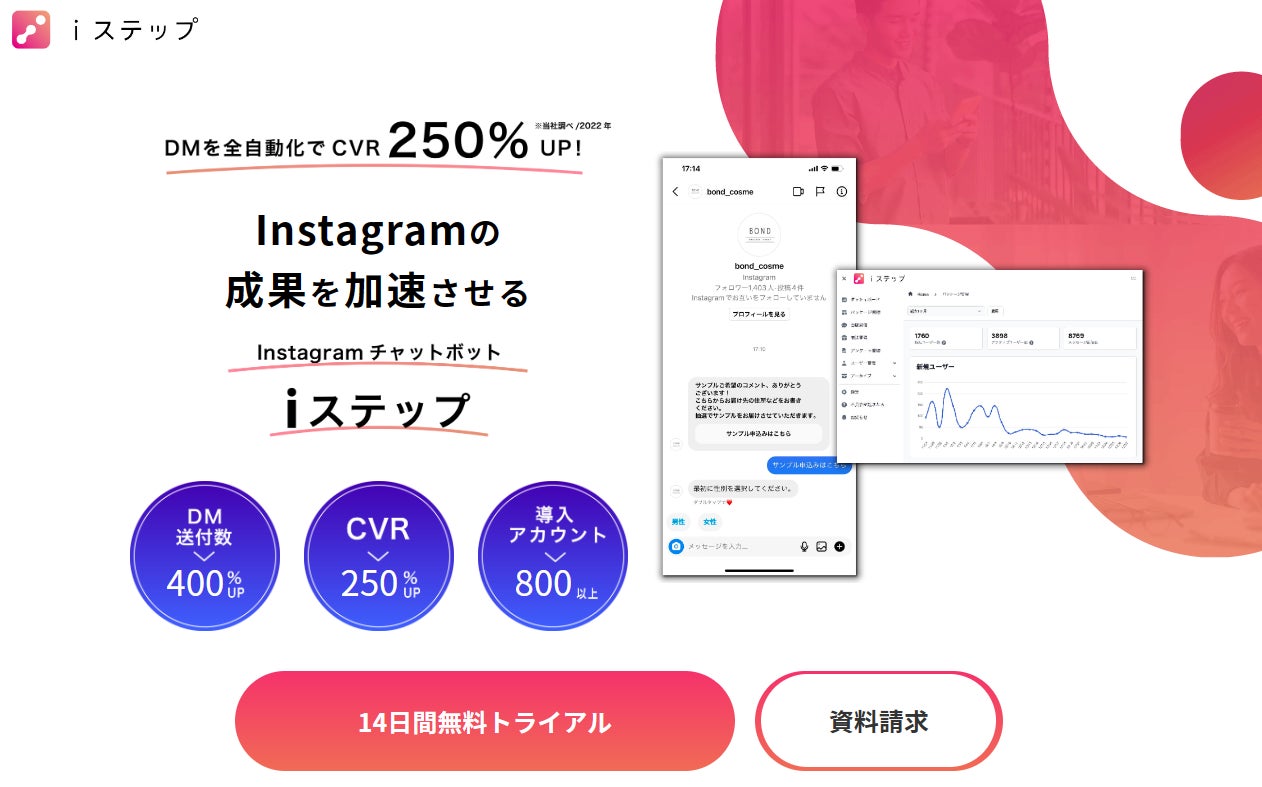 そこで、弊社はInstagramをビジネス活用する方々とユーザーがより深いコミュニケーションができるチャットボットツール「iステップ」を開発し、Meta社公式APIの承認を受け、ツールのサービス提供を実施しております。2022年6月のYouTube令和の虎CHANNELで完全ALLを達成して以降、利用数は急増しており、現在800アカウント以上にご利用をいただいております。また、伊藤忠商事株式会社や株式会社SUPER STUDIO、株式会社ドリームファクトリー、株式会社晴れる屋など多くの企業様にもご利用いただいております。