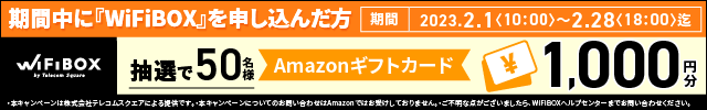 ・本キャンペーンは株式会社テレコムスクエアによる提供です。本キャンペーンについてのお問い合わせはAmazonではお受けしておりません。ご不明な点がございましたら、WiFiBOXヘルプセンター(https://faq.wifibox.jp/hc/ja)までお問い合わせください。