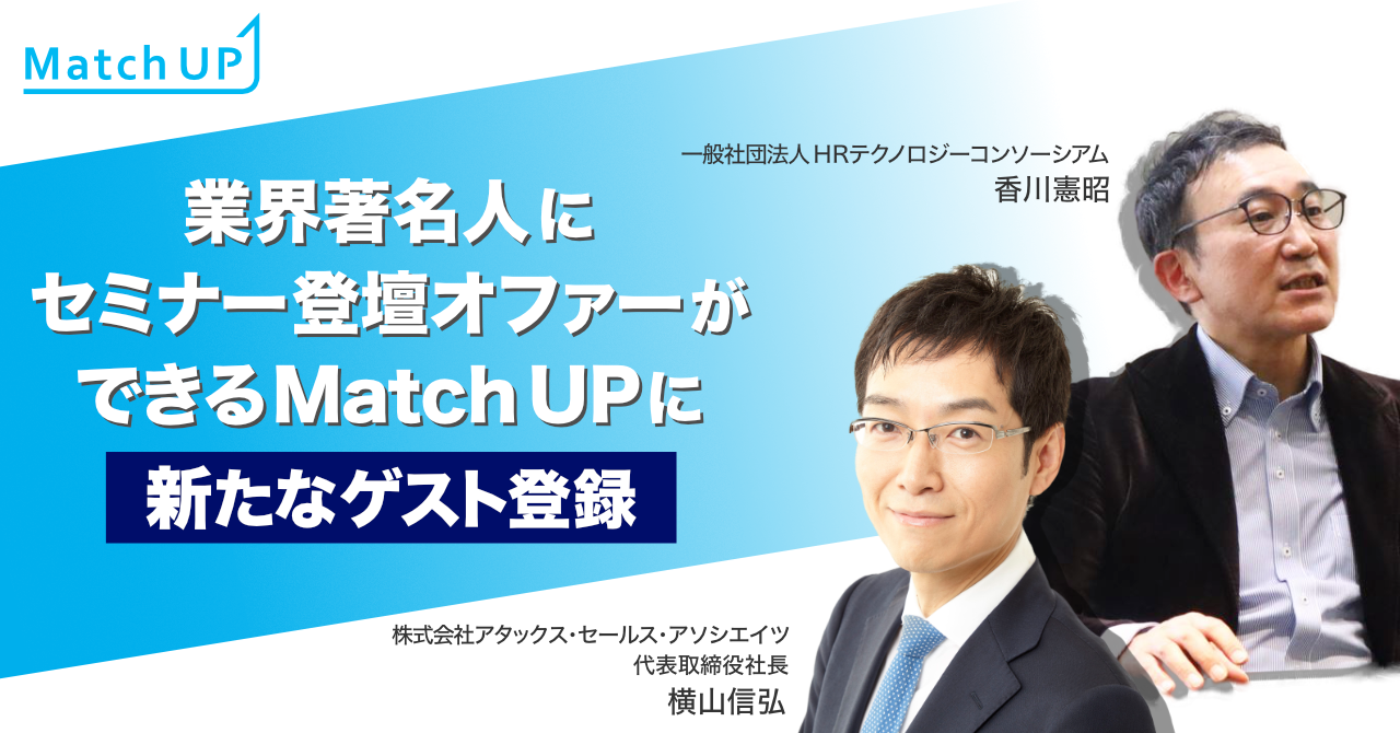 するセミナー/イベントへの登壇オファーができるマッチングサイト「Match UP」に、一般社団法人HRテクノロジーコンソーシアムの香川憲昭氏、株式会社アタックス・セールス・アソシエイツ 代表取締役社長の横山信弘氏など、