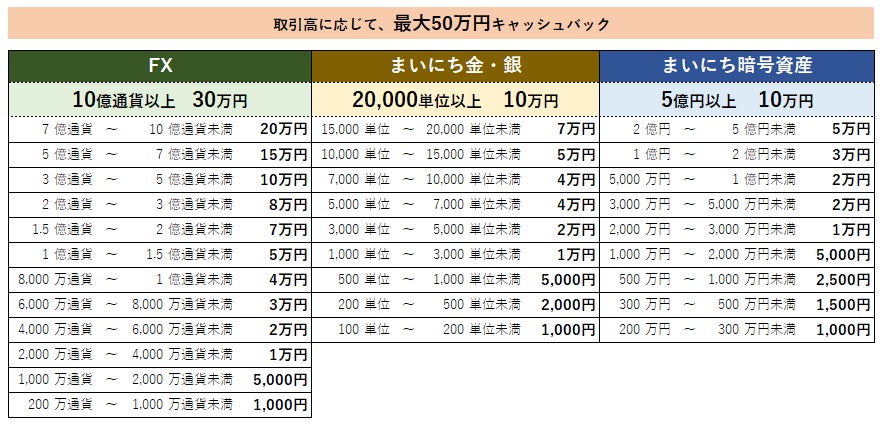 FX(パートナーズFX、パートナーズFXnano)、の取引高に応じて最大30万円、まいにち金・銀、まいにち暗号資産の各取引高に応じてそれぞれ最大10万円、合計で最大50万円キャッシュバックいたします。
