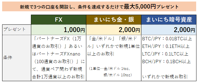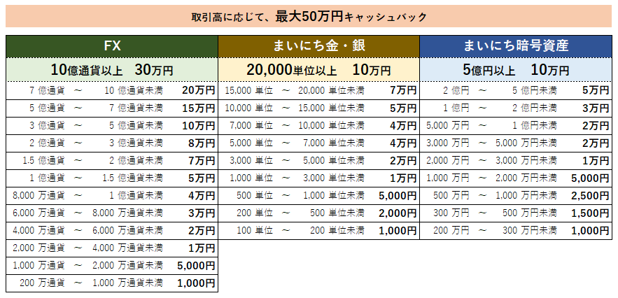 FX(パートナーズFX、パートナーズFXnano)、の取引高に応じて最大30万円、まいにち金・銀、まいにち暗号資産の各取引高に応じてそれぞれ最大10万円、合計で最大50万円キャッシュバックいたします。