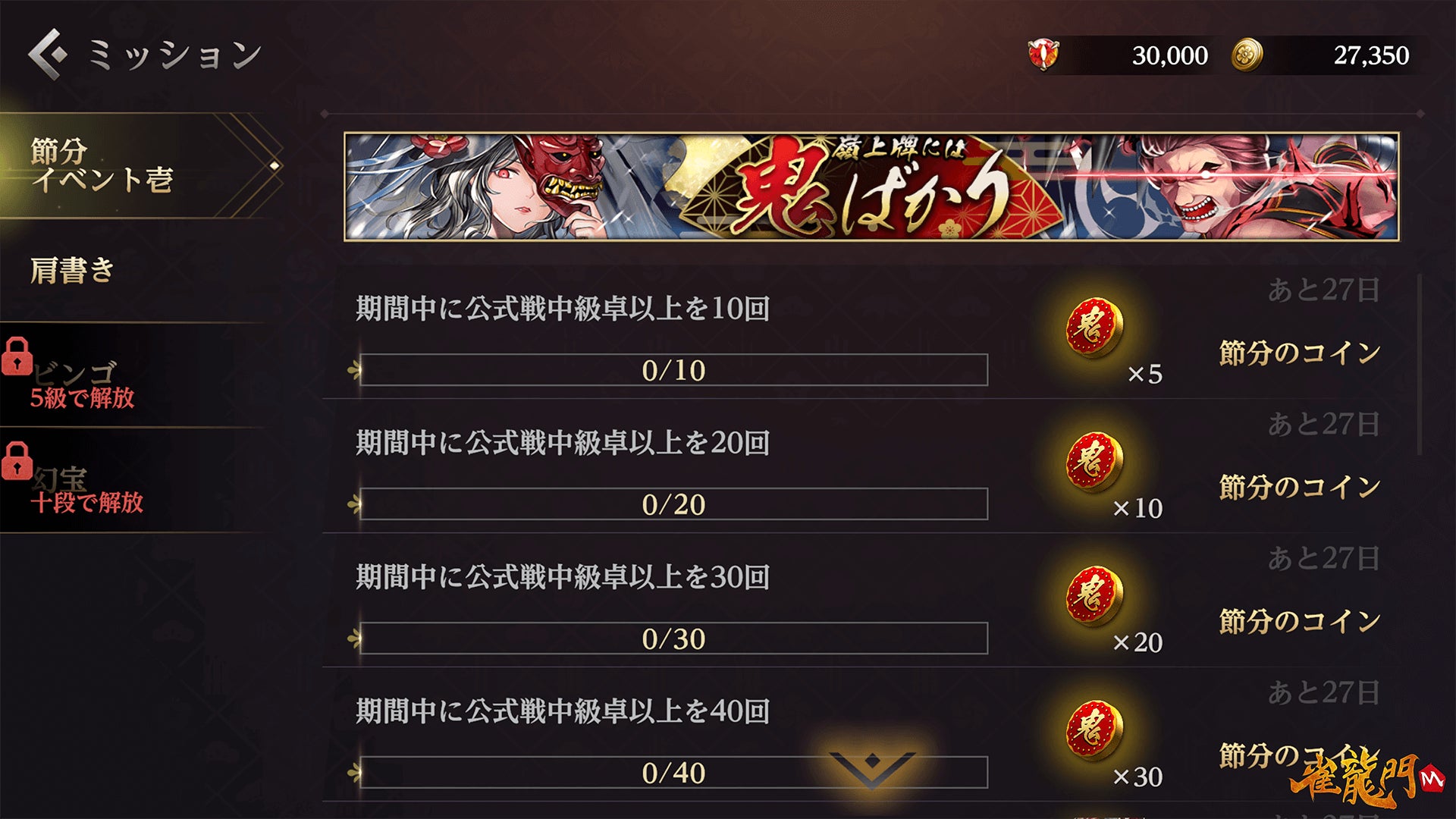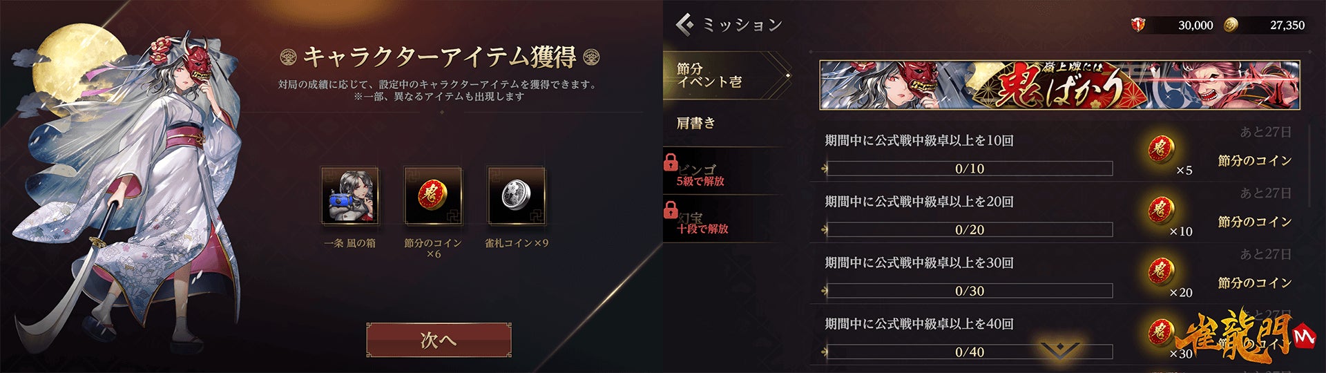 公式戦(中級卓以上)で獲得できる対局報酬の「節分のコイン」が増加し、より多くの「節分のコイン」を獲得することができます!