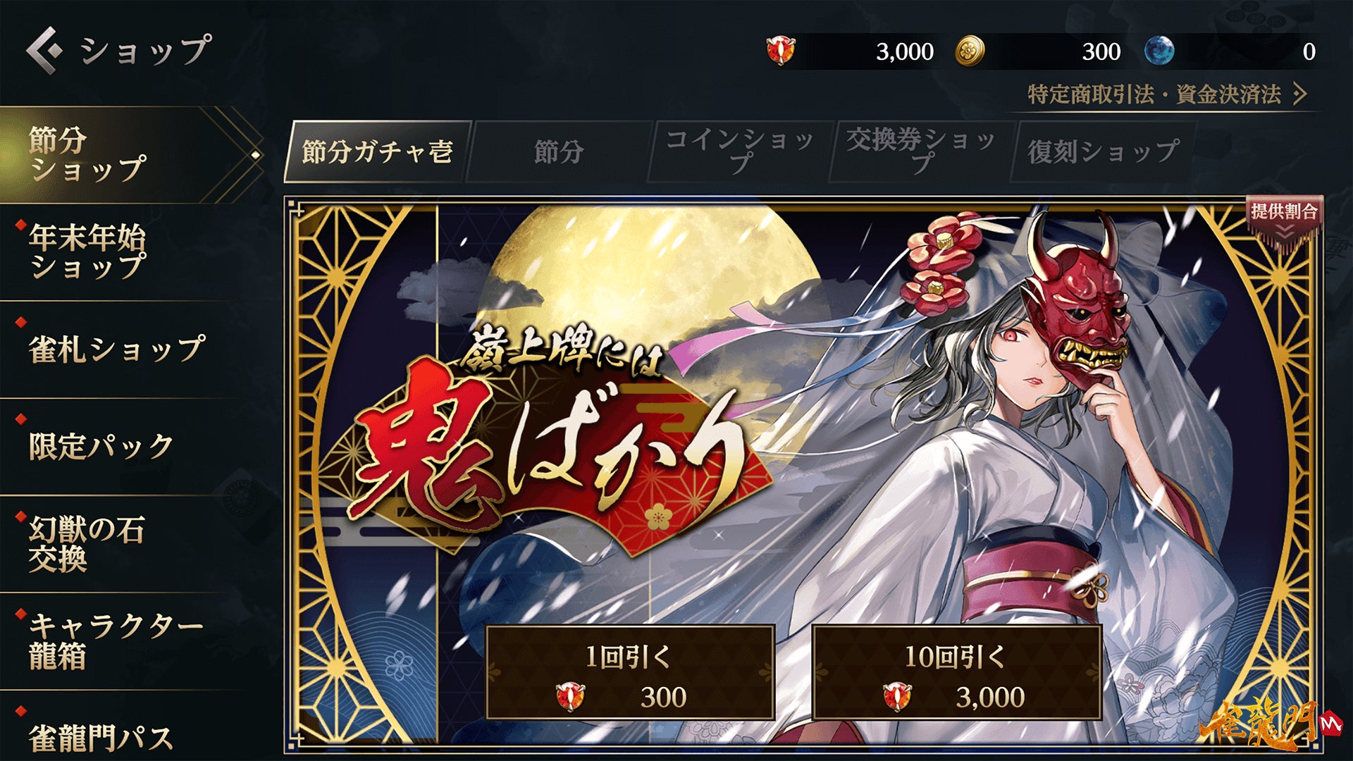 開催期間中、公式戦(中級卓以上)の対局報酬、イベントミッション報酬、ルーレット、節分ショップの商品などから入手が可能な「節分のコイン」を集めて、いろいろな限定アイテムと交換しましょう。