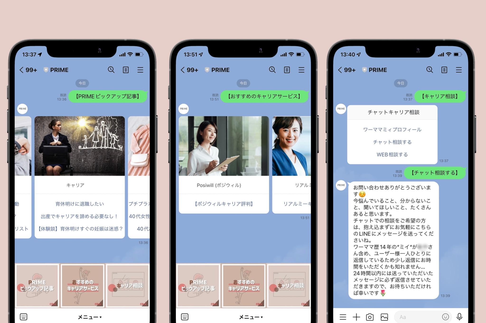 公式LINEでは、PRIMEがキュレーションした厳選記事の閲覧や、LINEチャット相談受付の他、個別のお悩み相談もいただけます。