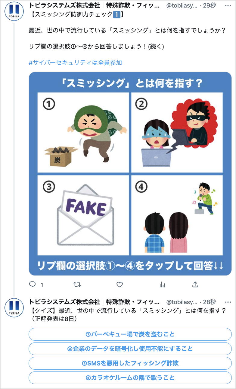 開催期間中、トビラシステムズの公式Twitterアカウントにて、「クイズで診断!スミッシング防御力チェック」と題し、スミッシングに関する知識や対策を楽しく学べるコンテンツの発信を予定しています。Twitter上で参加できるクイズなどを発信予定ですので、ぜひ気軽にご参加ください。