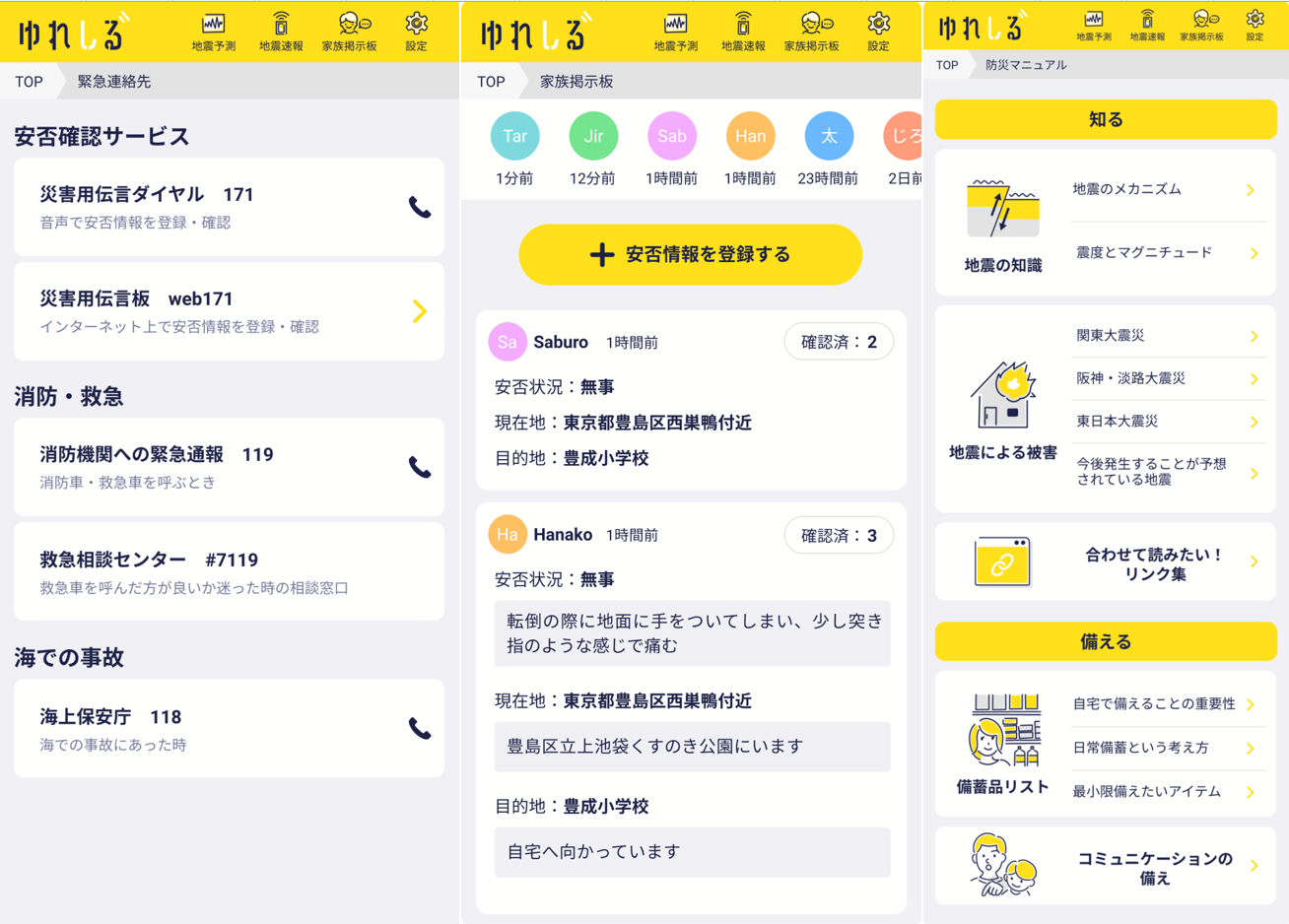 有事の際に利用できる緊急連絡先や避難所リスト、家族掲示板などの機能を搭載。地震予測が発令された場合に大切な人と一緒に事前に備えることができます。