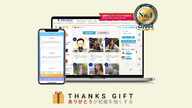 『THANKS GIFT』 は感謝・褒めるというコミュニケーションをきっかけに様々な組織課題を解決するエンゲージメントプラットフォームです。