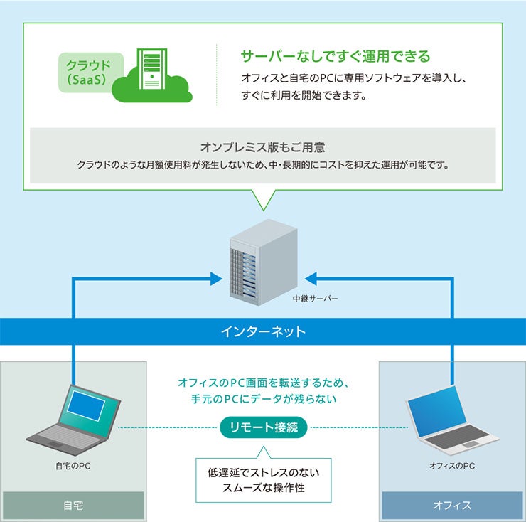 本機能では、出張先やテレワーク中に、手元のPCからオフィスにあるPCをリモート操作し、業務に活用いただけます。オフィスのPC画面を転送することになるため、業務終了後も手元のPCにデータが残らずセキュアな運用が可能です。また、リモート接続時は低遅延でストレスのないスムーズな操作が行えます※1。