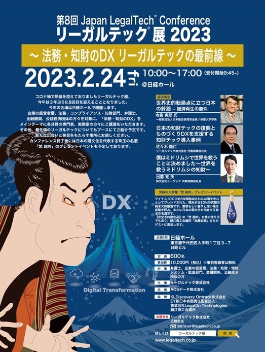 コロナ禍で3年ほど開催を控えておりましたリーガルテック展ですが、今年は、3年ぶりに開催することとなりました。今年の会場は、日経ホールで開催します。企業の経営者層、法務・コンプライアンス・知財部門・弁護士、金融機関、公益経済団体の方を対象に「法務・知財のDX」をメインテーマに各分野の専門家、実務家の方々にご講演いただきます。その他、最先端のリーガルテックについてもブースにてご紹介させていただきます。新たな出会いと発見をもたらす場所に是非、お越しください。カンファレンスの終了後には、日本の酒文化を代表する珠玉の名酒「梵 超吟」のプレゼントイベントも予定しております。