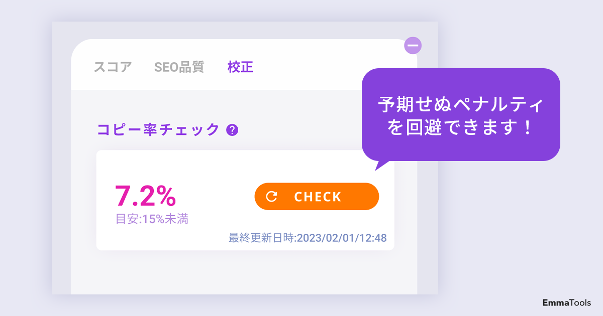 EmmaToolsには、著作権の問題やコピーコンテンツとされてペナルティを受けるリスクを低減させる機能も備わっています。記事制作後は、SEOの品質を数値評価する機能とコピー率をチェックする機能で記事を確認することができ、AIライティングと組み合わせて、より効率的に記事作成することができます。