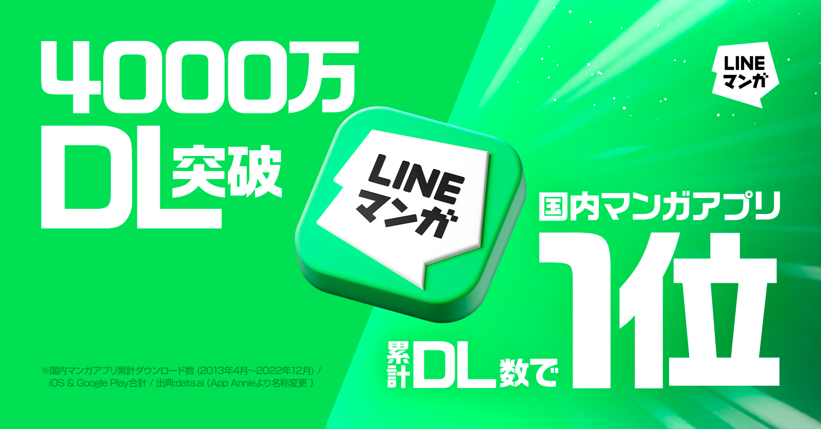 「LINEマンガ」は、スマートフォンやタブレットで気軽にマンガ作品が楽しめる電子コミックサービスです。このたび、2022年12月に国内アプリ累計ダウンロード数が4,000万を突破しました。また、2013年のサービス開始以降、国内マンガアプリの累計ダウンロード数において、No.1を独走しています。※