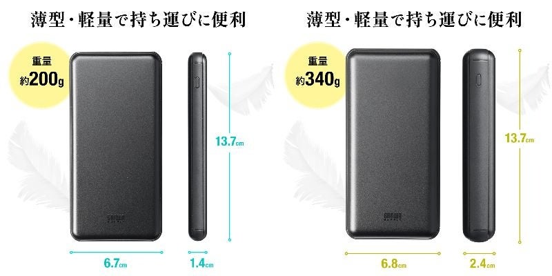 本製品のサイズと重量は、700-BTL050BK(10000mAh(3.85V換算))が約W67×D14×H137mm・約200g、 700-BTL051BK(20000mAh(3.85V換算))が約W68×D24×H137mm・約340gです。