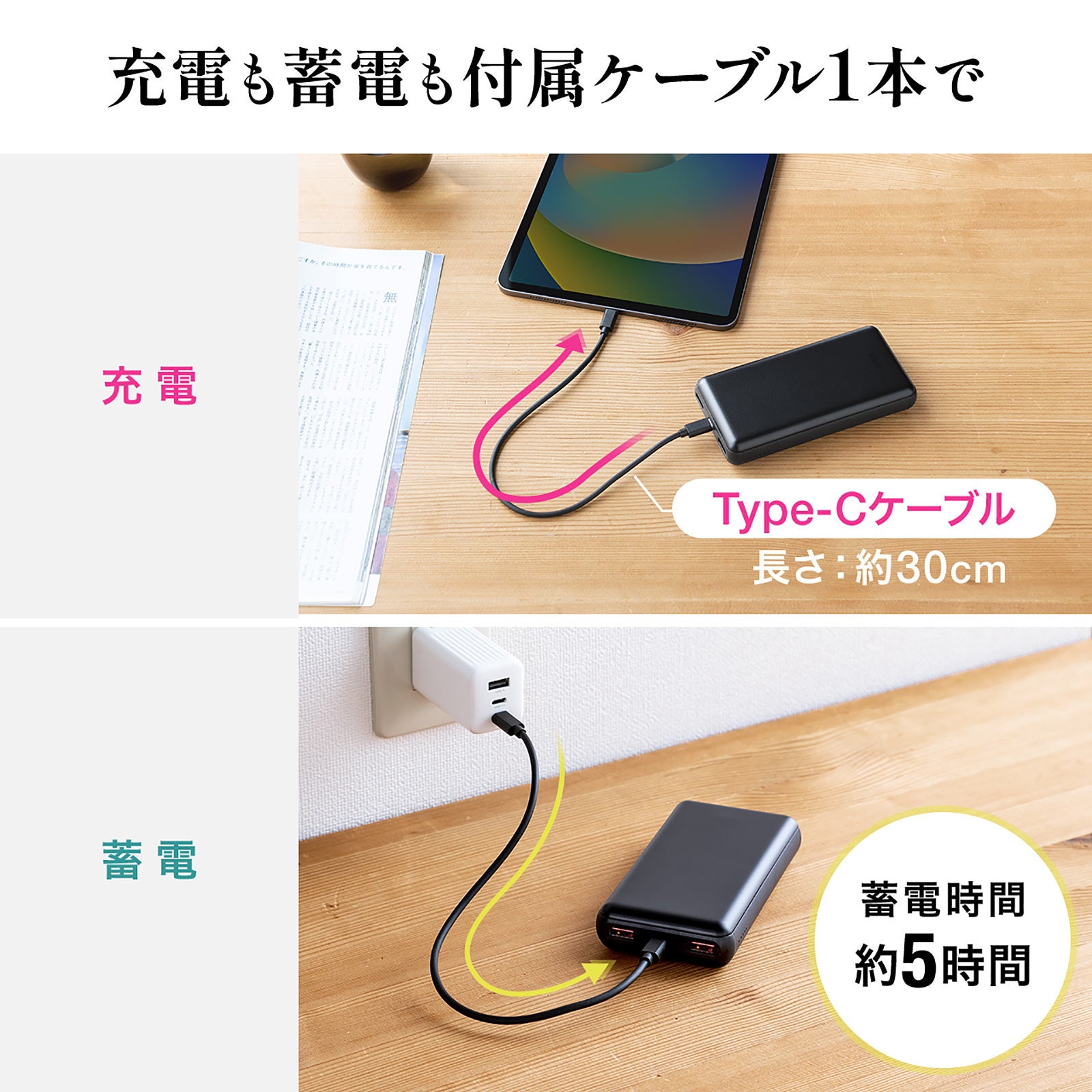 接続機器の充電と本体の蓄電に使えるUSB Type-Cケーブルを付属しています。