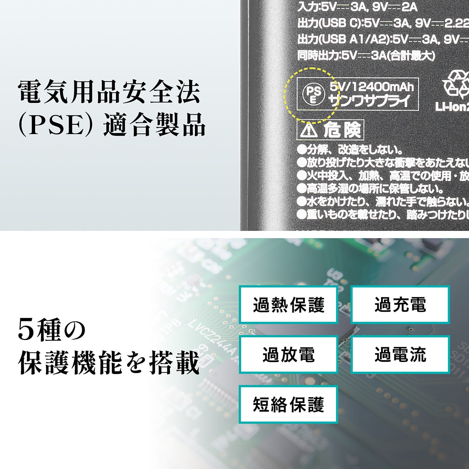 電気用品安全法(PSE)の技術基準に適合した安全性の高いモバイルバッテリーです。本体及び内蔵電池を異常発熱から保護する過熱保護機能を搭載しています。